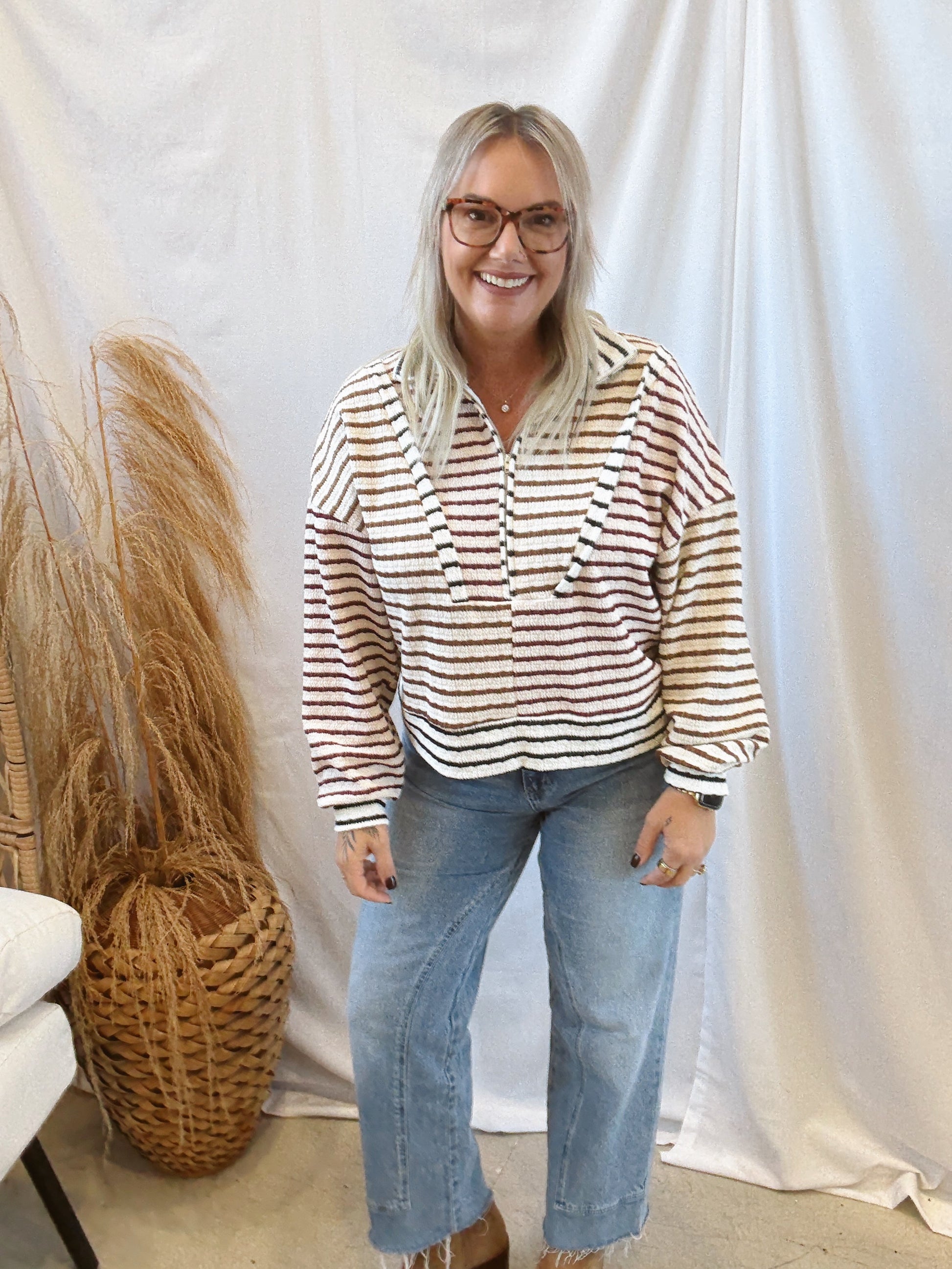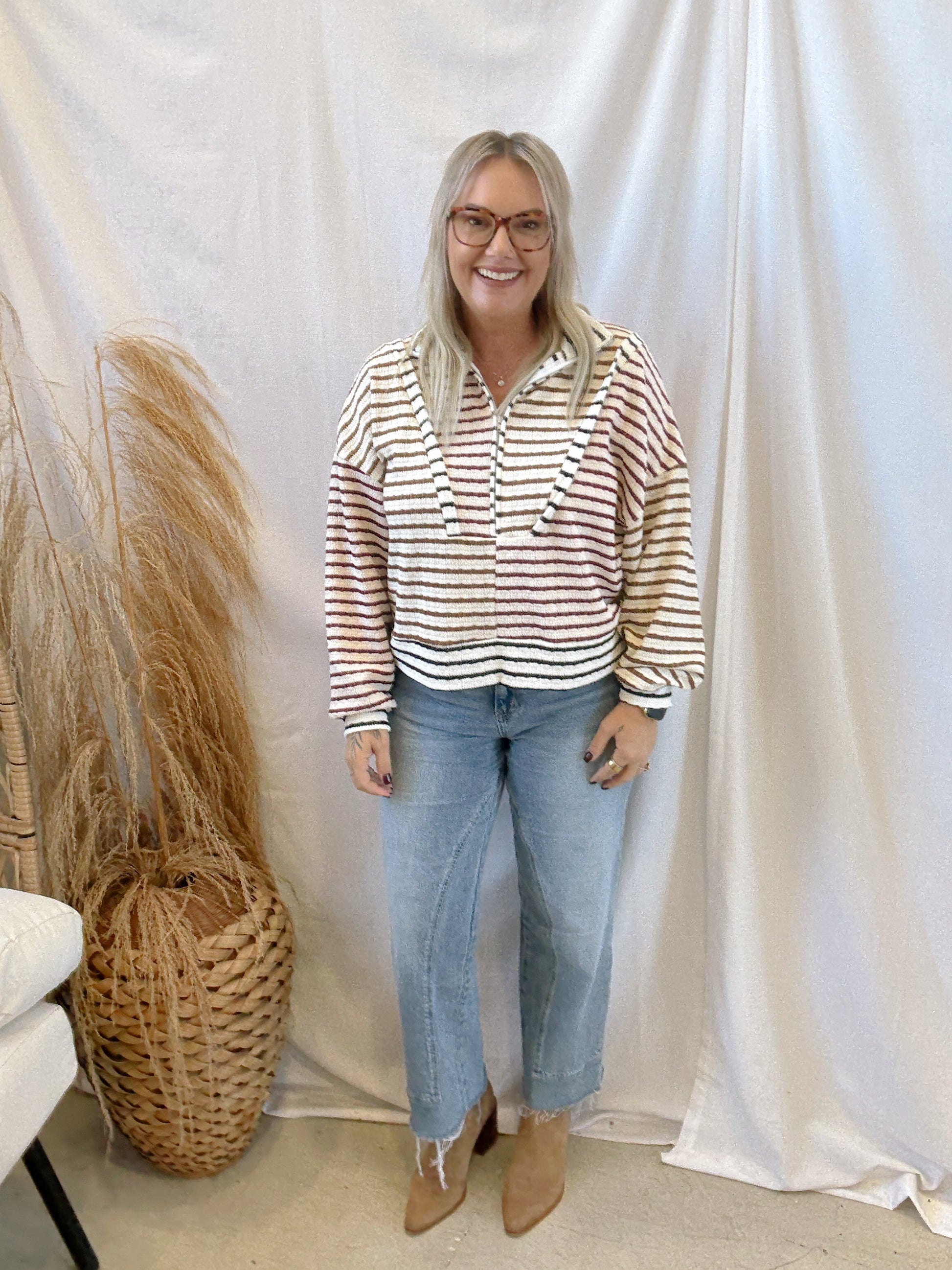 Stay cozy and cool in this Wine Funnel Neck Quarter Zip top. Its oversized funnel neck and zip-up front give you playful layering options, while long drop-shoulder sleeves add relaxed vibes. The multi-color stripe print contrast details bring a fun pop of pattern without overwhelming your look. Perfect for casual days when comfort meets style with a twist.